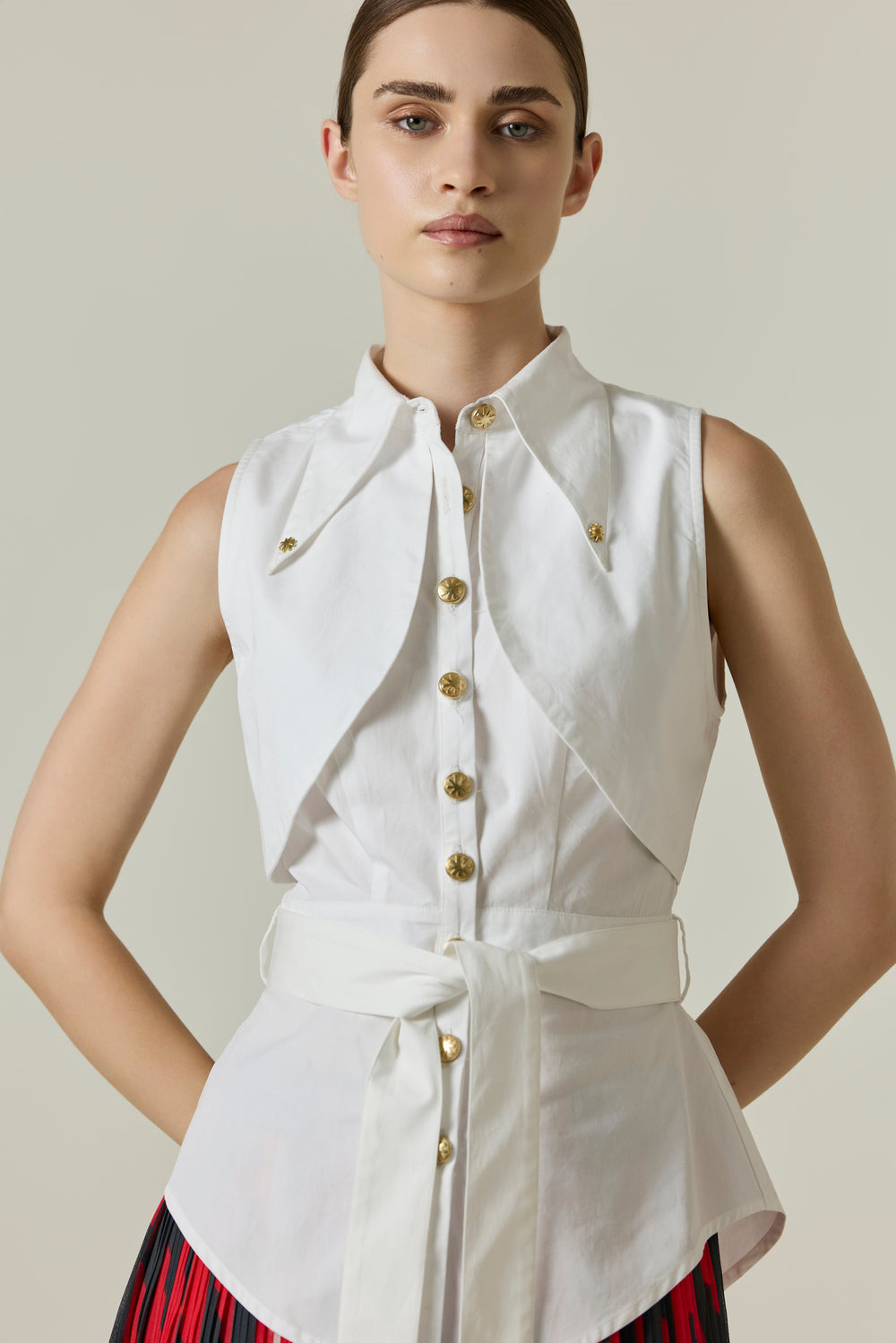 Luz by ANI is a play of contrast—light and shadow, structure and flow. A sleeveless cotton shirt stands sharp with a raised collar and gold monogram buttons, cinched at the waist with a self-tied belt. Below, a pleated georgette skirt moves in red and ebony strokes. Precision above, cadence below—one ensemble, one rhythm.