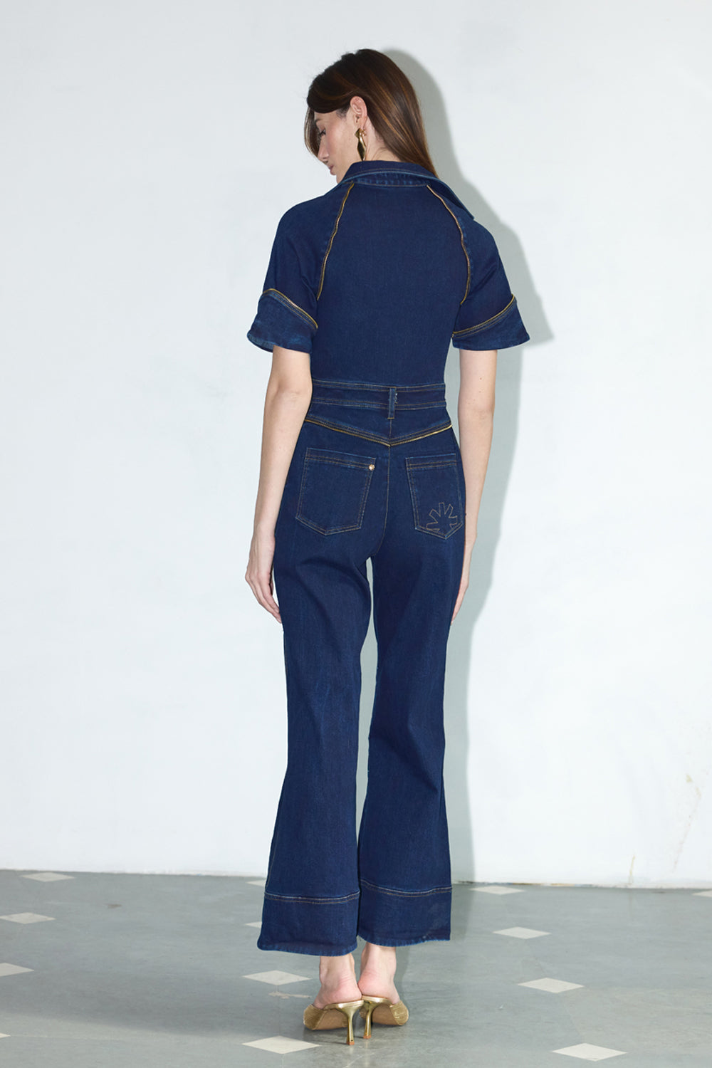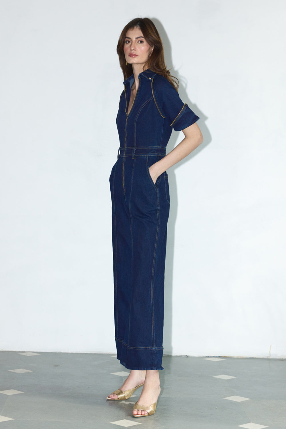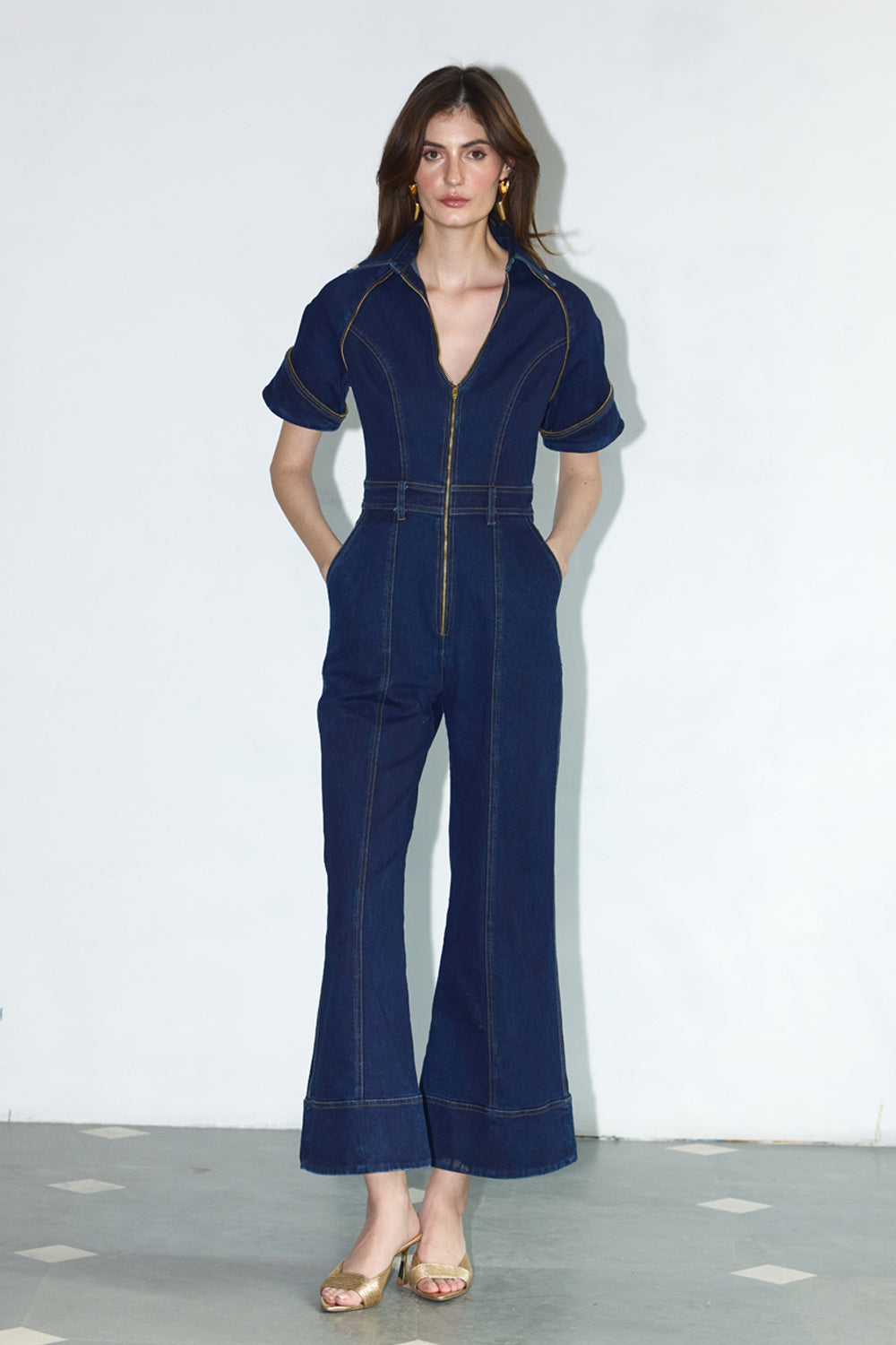 - جمبسوت من قماش الدنيم يتميز بفتحة رقبة على شكل حرف V وياقة جريئة.