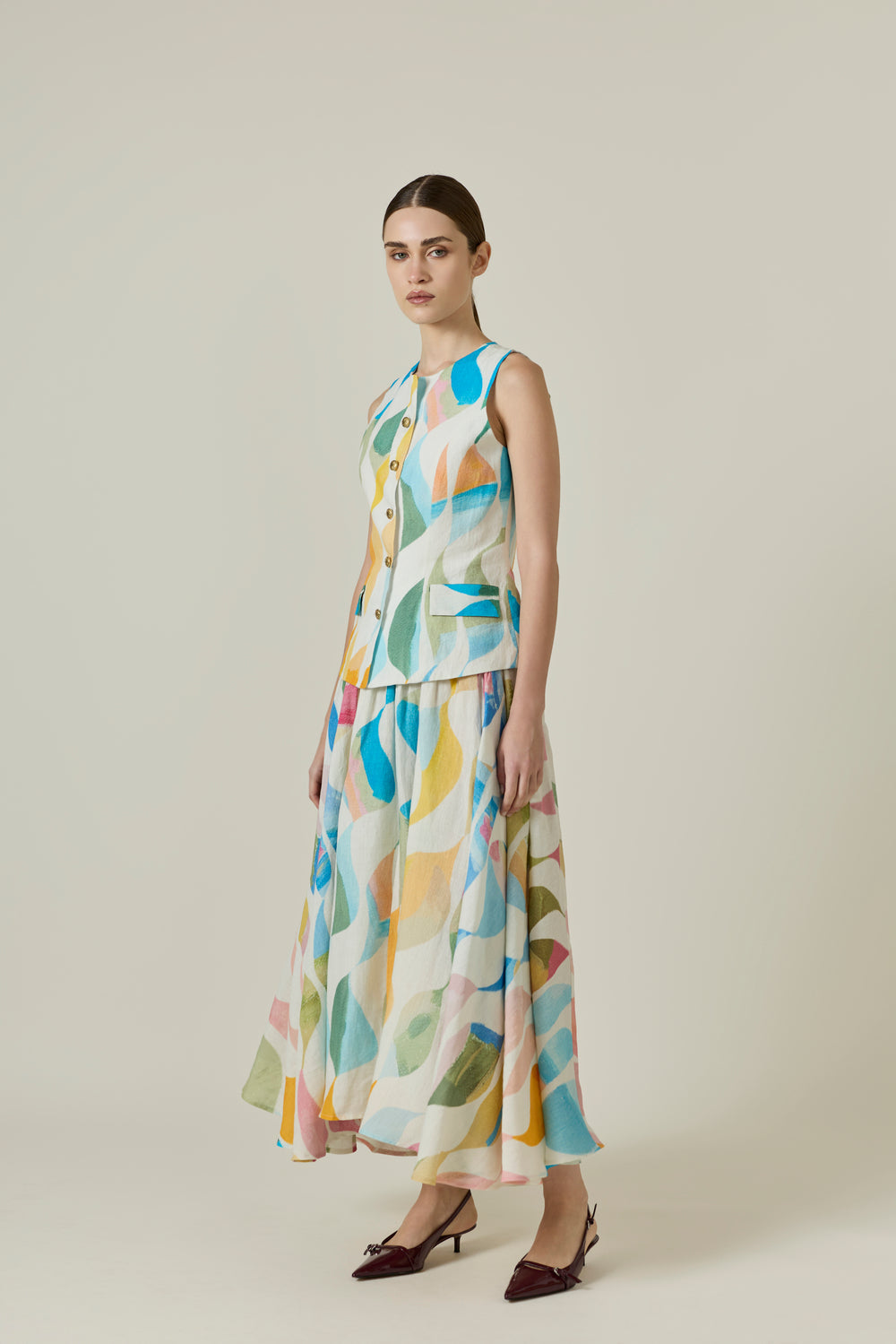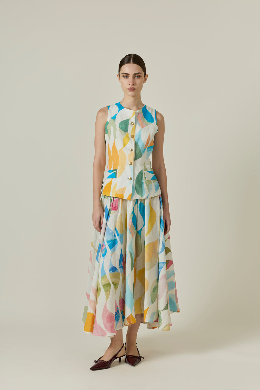 Kaia by ANI is whimsical yet grounded—equal parts polish and ease. The gathered A-line skirt adds lightness and movement. Style it with leather sandals, oversized sunglasses and a sculptural clutch for a refined, relaxed look.